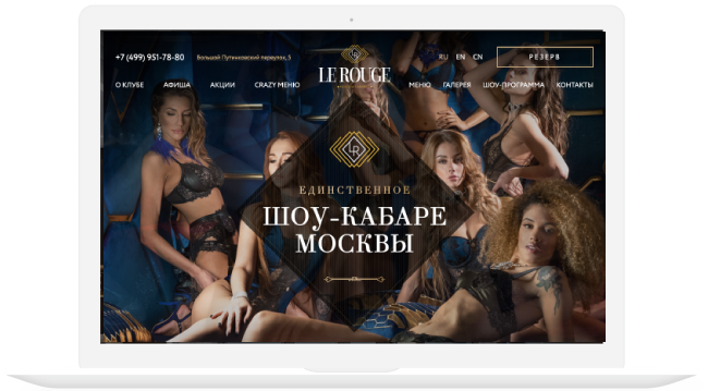 Le Rouge Cabaret – единственное шоу-кабаре в Москве, представляющее программу уровня знаменитых парижских Lido и Moulin Rouge, и берлинских Eldorado и Uberbrettl. Ежедневно здесь показывают высококлассное шоу: эротический балет, балет Варьете, Бурлеск-шоу, цирковые гимнастки и живой вокал. МЫ СДЕЛАЛИ LANDING PAGE Цели: Разработать мультиязычный и мультирегиональный сайт, который расскажет о главных преимуществах шоу-кабаре и подчеркнет его статусность. Решение: Элегантный дизайн в темных с золотым оттенках, в основе которого большое количество красивых широкоформатных фотографий девушек и шоу-программ. Посмотреть сайт + АНАЛИТИКА Динамический коллтрекинг. Callibri - сервис коллтрекинга для отслеживания звонков и мини-CRM. Wifi-аналитика. Беспроводная аналитика - инструмент сбора, анализа и использования оффлайн-аудиторий. ПРОДВИЖЕНИЕ Цели. Имиджевая реклама стриптиз-клуба как единственного шоу-кабаре в центре Москвы. Решение. Комплексная digital-стратегия, включающая в себя тщательную