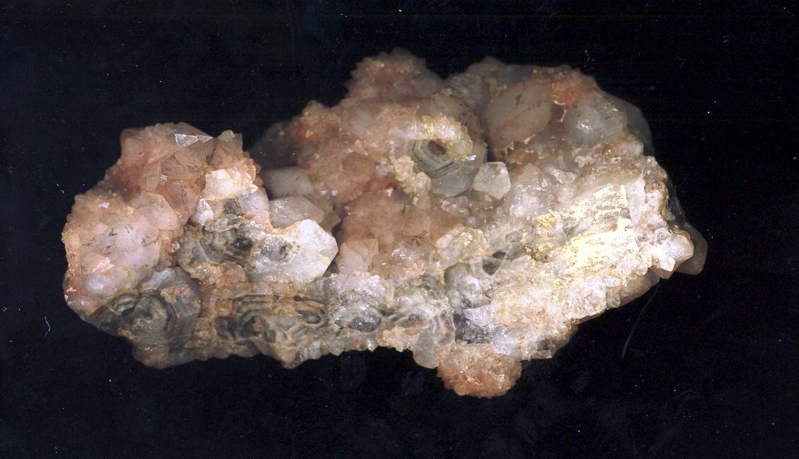 В породах фундамента кварцевая минерализация в виде щеток тоже встречается, но выглядит совершенно иначе. (Об этом в другой статье). Кроме того в породах фундамента встречаются жилы массивного скрытокристаллического ноздреватого кварца с кальцитом мощностью в десятки см и длиной в десятки метров.