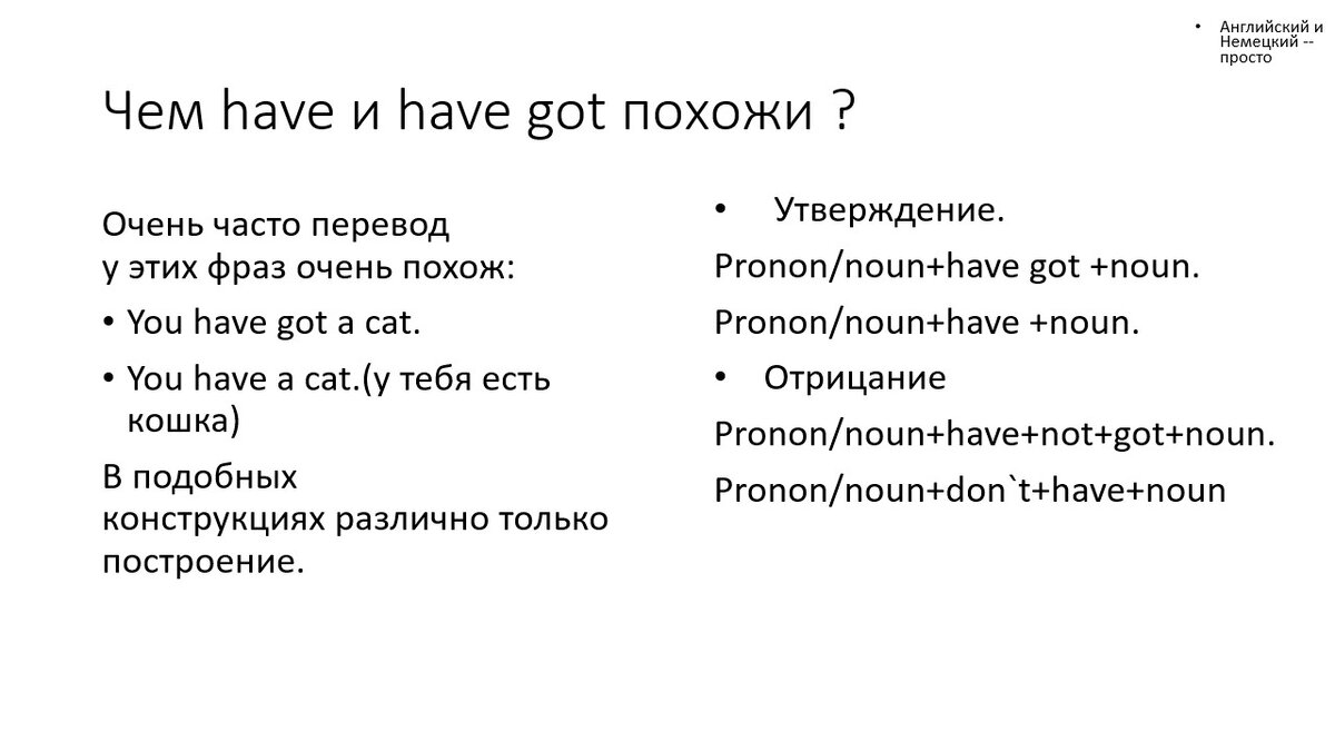 Нам очень часто приходиться использовать фразы have и have got ,но ,к сожалению, с ними часто возникает путаница ,а многие люди ,которые изучают английский, забывают о возможности использования have got ,что часто мешает правильному переводу с английского языка. Использование Have и Have got. Слово have очень известно ,наверное, его помнят почти все люди изучающие английский язык. Мы используем have и как глагол со значением "иметь в собственности" ,и как вспомогательный глагол ,а также have имеет множество особенностей и выражений ,в которых его перевод будет отличаться от привычного значения. Например, фразы ,в которых have не переводится: Оттенок слова Have более устойчивый ,чем оттенок фразы Have got. Многие носители языка используют Have got в значении "я получил что-то", "приобрел что-то". Смотреть на фразу лучше со стороны present perfect(have + participle 2) и переводить не "У меня есть(Просто факт. Есть и было до этого.)" ,а " У меня уже есть(Не было ,но недавно появи