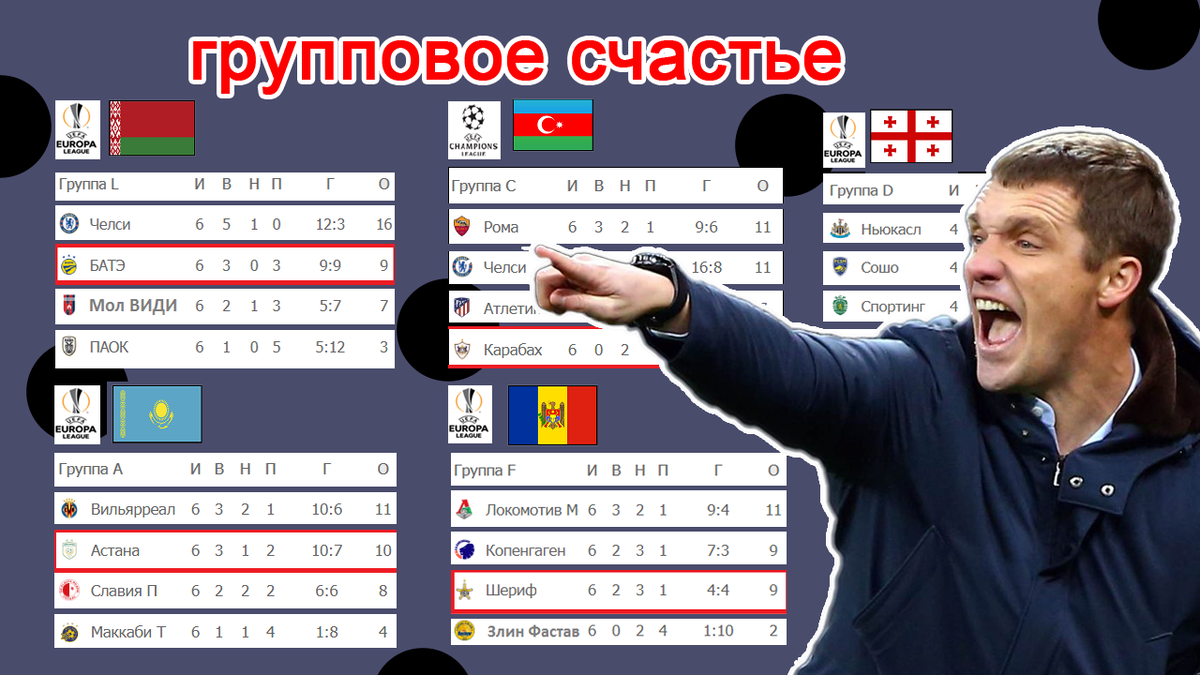 Большинство подписчиков нашего канала могут сегодня отдохнуть. Эта статья будет интересна для любителей футбола Молдовы, Азербайджана, Грузии, Беларуси и Казахстана. Мы сравним выходы их клубов в группу Лиги Чемпионов и Лиги Европы. Я делал все что в моих силах, но армянских клубов на групповых этапах не обнаружил. Мне очень жаль. В сезоне 2004/2005 впервые появился групповой турнир в Кубке УЕФА. Этот сезон памятен тем, что «Динамо» Тбилиси пробилось в группу D, но заняло последнюю строчку. Забегая вперед скажу, что это единственный выход в группу еврокубков грузинского представителя. Представитель Азербайджана впервые пробился в групповой этап еврокубков в сезоне 12/13. Им стал "Нефтчи" . Первым казахстанским клубом в группе стала вовсе не "Астана", а "Шахтер" Караганда (13/14). Начинается самая интересная часть выпуска. Подводим итог. Представителям 3 стран удавалось выступить в группе Лиги Чемпионов. Белорусский БАТЭ был здесь 5 раз. В Лиге Европы рекорд принадлежит Азер