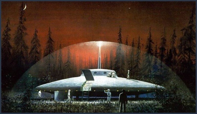Когда он спускается к озеру, он может видеть, как НЛО начинает взлетать. Красный и белый свет исходит от корабля, когда он бесшумно поднимается над верхушками деревьев. Затем он внезапно разогнался до невероятной скорости и исчезает.