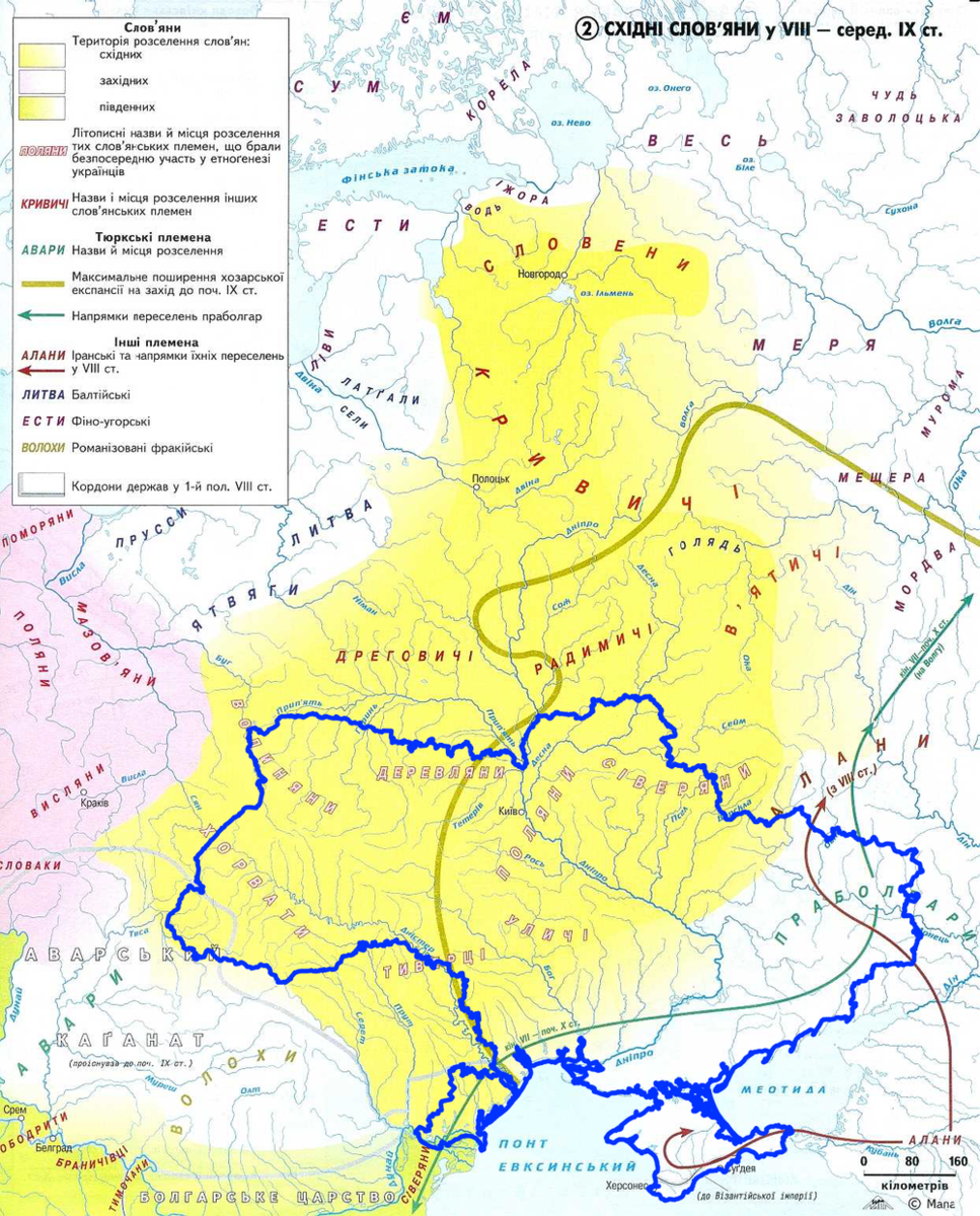 Как видно по этой и предыдущей карте, в те времена современные восточные и южные регионы Украины не были заселены славянами. Они были частью Дикого Поля — Евразийской Степи. Постоянного населения там не было. Хоть попытки колонизировать эти территории предпринимались уже тогда, этому мешали постоянные набеги кочевников. Наши предки заселили эти места только в XIV-XV, когда они вошли в состав Великого княжества Литовского. Тогда там появились казаки.