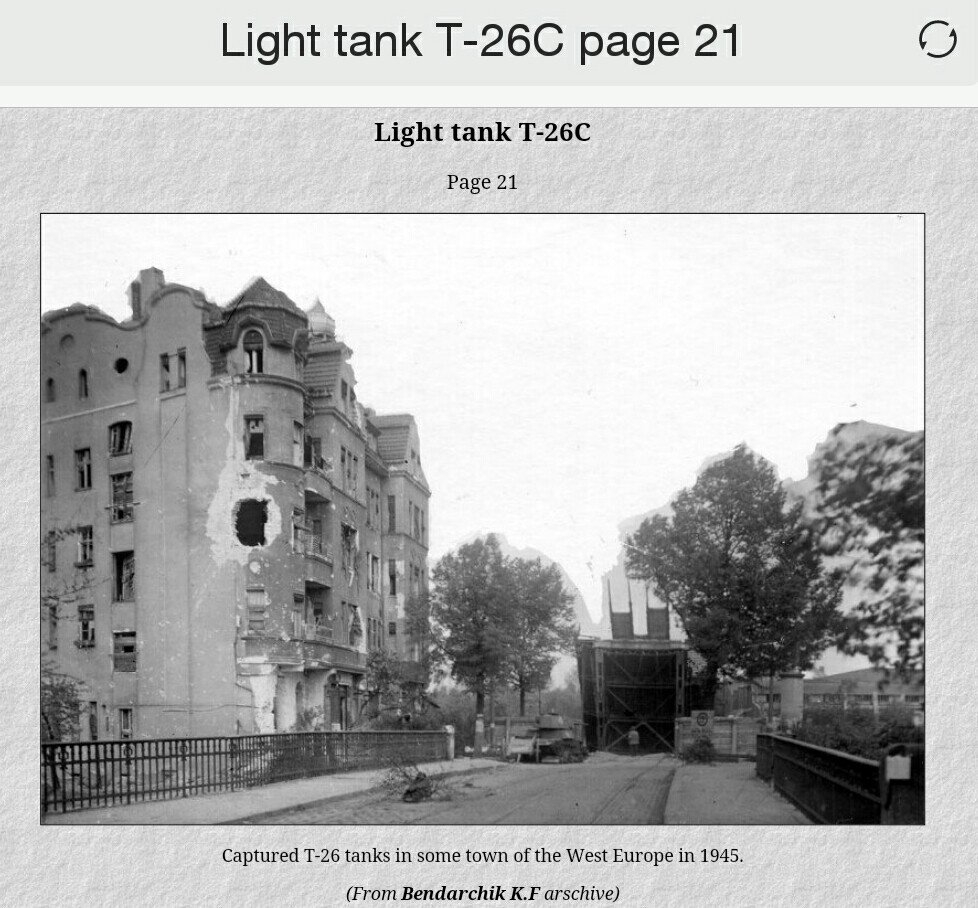 Тем временем, пока горячие головы рассказывают байки об армадах МС-1, атаковавших гитлеровцев под Устилугом 22 июня 1941 года или много позже под Москвой, история иногда действительно преподносит сюрпризы долгожительства бронетехники. Вот такая интересная фотография имеется на англоязычном сайте http://www.beutepanzer.ru посвященном использованию трофейной техники в Вермахте. Подпись гласит, что на фото, если сильно приглядеться, можно увидеть захваченный танк Т-26, образца 1939 года (Т-26С по западной классификации) в одном из городов Западной Европы в 1945 году. Фото происходит из архива Бендарчика К.Ф.(?). Любопытно, что не уточняется кем захваченный. И вот сегодня история получила свое продолжение. В группе ВКонтакте Пермского краеведческого музея выложили фотографии из архива Константина Алексеевича Бендарчика, который, хранится в фондах музея. В итоге мы получаем известную фотографию в большом разрешении и с некоторой атрибуцией. Аннотация к серии фотографий: Результаты боевой