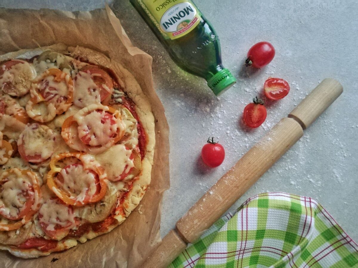 Предлагаю вам простой рецепт пиццы на кефире. Тесто для неё делается очень быстро и сразу готово к работе. В зависимости от толщины получится мягким или хрустящим. Для начинки подойдут любые сезонные овощи, которых сейчас в избытке. Я использовала перец, помидоры и баклажан. Под сырной корочкой получилось очень вкусно! Ингредиенты Для теста: Для соуса: Для начинки: Приготовление Духовку разогреваем до 180 градусов. Баклажаны очищаем от кожуры, нарезаем полукругами и присыпаем солью. Перемешиваем руками. Даём постоять 10 минут. Это нужно для того, чтобы ушла горечь. Обжариваем баклажаны с двух сторон на растительном масле. Перекладываем на тарелку. Остальные овощи нарезаем: помидоры тонкими кружками, перец кусочками поперёк. Сыр трём на терке. Готовим тесто. В большую миску наливаем кефир и добавляем соду, размешиваем. Добавляем соль, сахар, растительное масло. Перемешиваем. Добавляем просеянную муку и замешиваем тесто ложкой, потом руками. Муки может потребоваться чуть меньше или чут