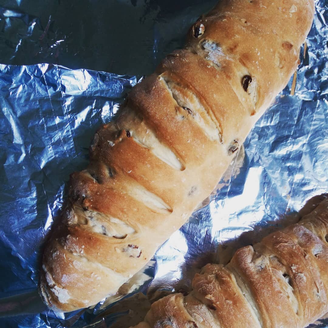 Сегодня для всех предлагаю рецепт домашнего хлеба.Хлеб получается вкусный,с хрустящей корочкой.Вместо изюма можно добавить орехи,кусочки шоколада и прочие плюшки.Конечно же он намного вкуснее чем покупной. Ингредиенты на 2 штуки -210 но теплой воды -1ч.л. сухих дрожжей -320гр пшеничной муки -30гр подсолнечного масла -2ст.л. сахара -0,5ч.л. соли -2 горсти изюма(темного или светлого) -1 горсть семечек или орехов В муку всыпать сахар,соль, дрожжи,семечки и изюм(изюм предварительно замочить в кипятке и обсушить.)В теплую,но не горячую воду добавить растительное масло и влить эту смесь в муку.Как следует вымешать тесто.Оставить на час до увеличения объема в дважды.Тесту нужно много времени, из-за добавок,с ними тесто поднимается дольше. Сформировать из теста два батона,оставить для расстойки на полчаса. Выпекать в разогретой духовке до готовности.Донышко должно быть золотистым,готовность проверяем зубочисткой-она должна выйти из хлеба сухой. Всем приятного аппетита и горячего хлеба к завтра