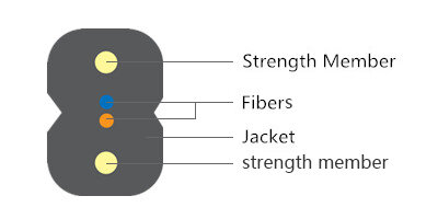 Плоский дроп кабель это оптический абонентский кабель, который применяется в сетях FTTH для прокладки как внутри помещений, так и для протяжки между зданиями и опорами. Этот тип волоконно-оптического кабеля иногда носит название кабель "последней мили". Оптический ДРОП кабель обычно содержит одно или два волокна, однако в настоящее время доступны также ДРОП кабели с количеством волокон до 12 и более. На следующем рисунке показано поперечное сечение плоского ответвительного кабеля с двумя волокнами.