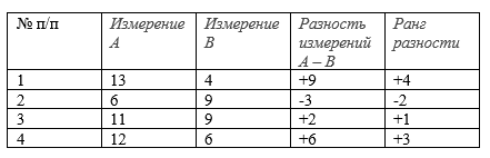 Например, имеются результаты полученных от четырех объектов парных измерений (A и B):