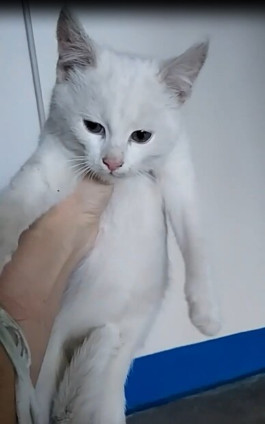 Мальчонка, месяца три, чисто белый ангорик. Внешне здоровый, худенький и пыльный. Из проблем женщина заметила только клещ в ушах.