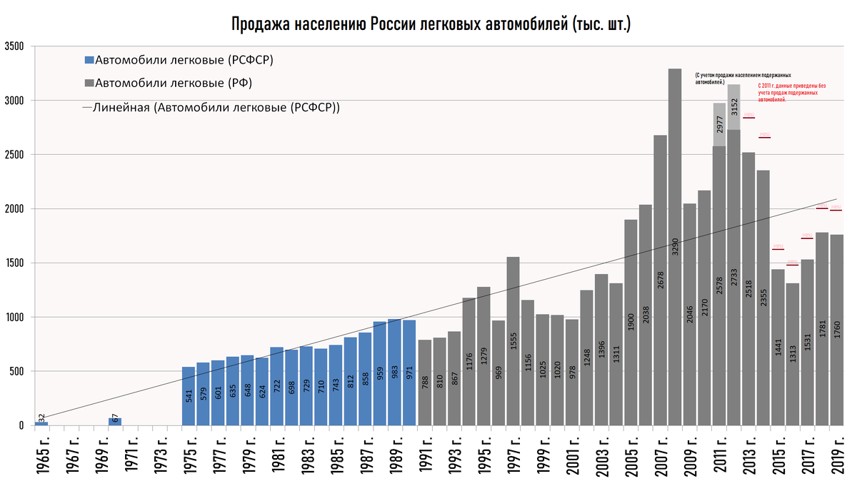 Данные о реализации населению взяты из сборников "РСФСР в цифрах" и "Российского статистического ежегодника". Правда в последнем с 2010 г. данные почему то не публикуются. Поэтому я взял цифры из сборника "Торговля в России" в разделе "Индексы физического объема розничной продажи" и высчитал, исходя из процентного отношения. Поэтому могут небольшие погрешности, т.к. высчитывал из округленных до десятых данных. Решил такой же статистический ряд составить с велосипедами и мотоциклами: А вот все вместе