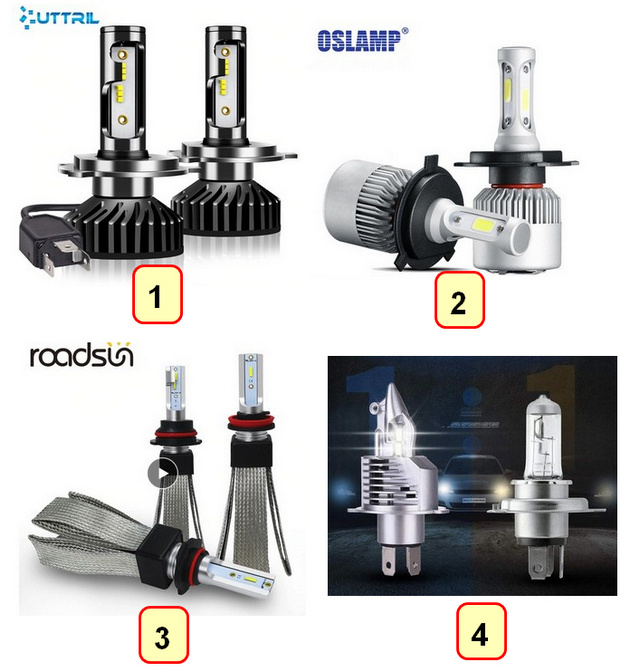 С первого взгляда — лучший вариант. И тебе пыле-влаго защищен, и никаких торчащих снаружи радиаторов/вентиляторов, и расположение светодиодов на подложке точно соответствует стандартной галогенке Н4. Но это — обманка для лохов. Мы уже миллион раз говорили о том, что LED лампы излучают кроме света много тепла. Аксиома при термодинамических расчетах электронной аппаратуры та, что для данного радиатора конечных геометрических размеров, даже самого оптимизированного, существует некий предел рассеиваемой мощности путем естественной конвекции. Все. Либо дуй на него, либо снижай подводимую мощность. Разработчики данного варианта так и сделали — уменьшили мощность. В результате данный вариант 4 по светоотдаче чуть-чуть превосходит стандартную галогенку Н4. В данном варианте теряется главное преимущество LED ламп — больший световой поток, чем от накальных, при меньшем токе потребления. Казалось бы — ну и что? Ведь корпус заводской фары рассчитан на рассеивание мощности, потребляемой стандартной накальной лампой, а она, как написано выше, составляет 60вт для Н4. Правильно, но та же галогенка прекрасно себя чувствует при температуре баллона в несколько сотен градусов, а светодиоды на подложке? И без частичной естественной циркуляции воздуха вокруг радиатора, как в варианте 1 и 3, размеры радиатора в данном варианте заняли бы значительную часть внутреннего пространства. Представляете, как это будет выглядеть?