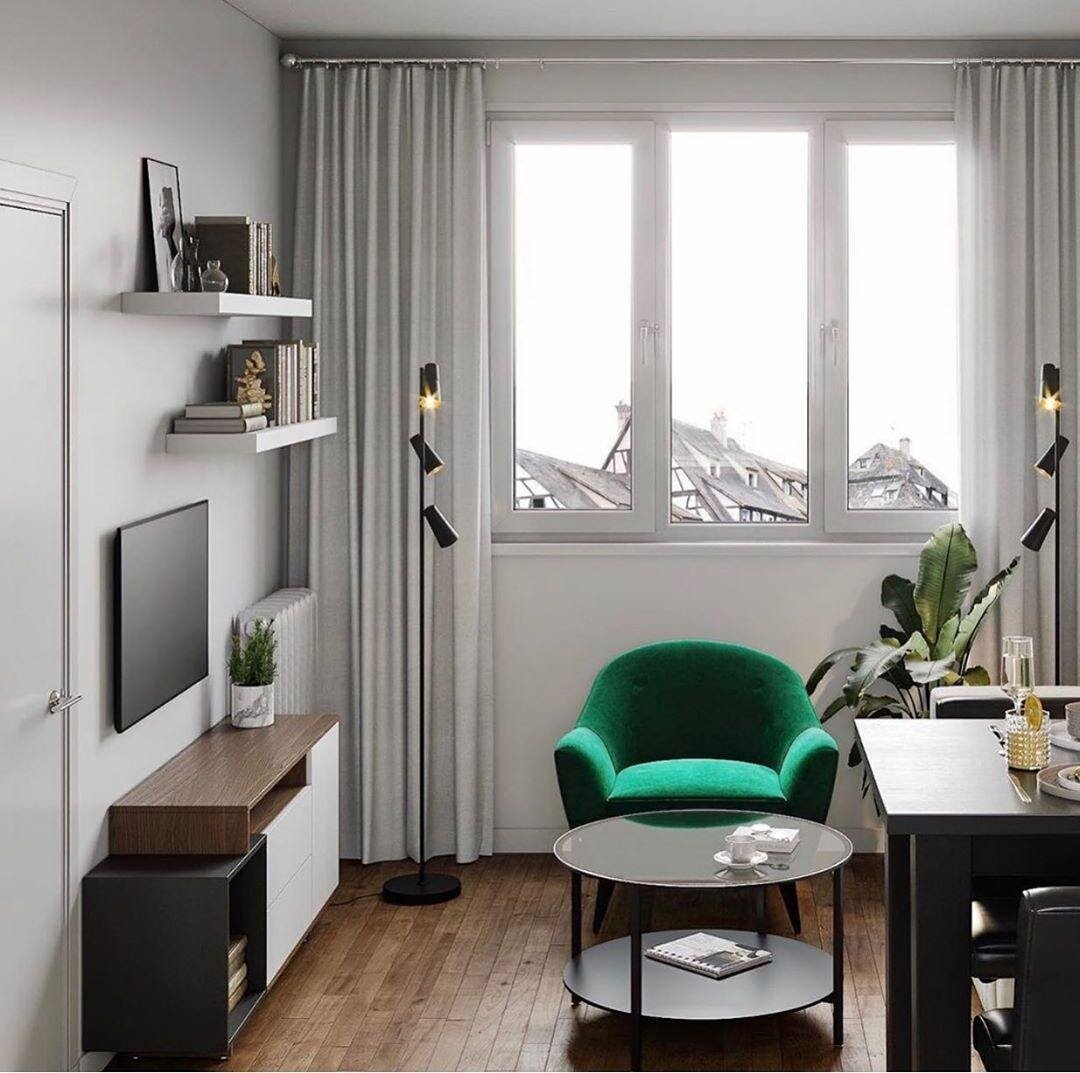 Обратите внимание на акценты: квартира оформлена в светлых тонах, но кресло малахитового оттенка здесь, тёмные фасады шкафов на кухне и со вкусом подобранные аксессуары делают помещение совсем не скучным.