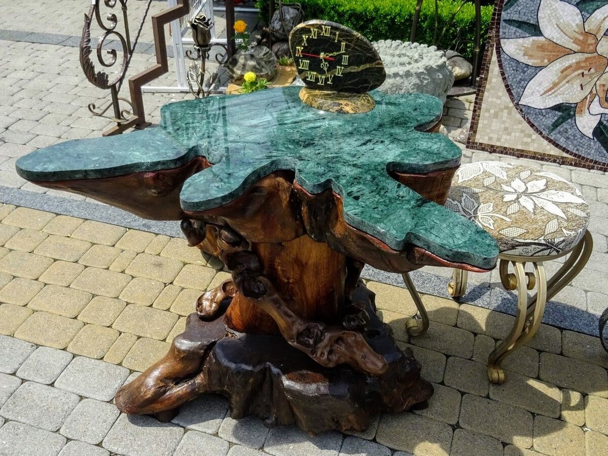 На кубанских ярмарках всегда много креативных вещей, сувениров и различных поделок ручной работы. Порой здесь можно найти причудливые и в то же время весьма оригинальные изделия... Мастера умело сочетают дерево с камнем и металлом, в результате получаются весьма красивые предметы мебели, украшения для интерьеров или ландшафтного дизайна. Картин и панно бывает тоже много. Мне особенно понравилось панно, выполненное в мозаичной технике из натурального камня. Часто умельцы привозят и довольно громоздкие скульптуры для оформления дома или дачи. Среди них встречаются не только массивные вазоны или рыбки для фонтанов, но и самые диковинные вещицы. Наверное нужно быть хорошим специалистом, чтобы сразу распознать материал из которого сделаны все эти скульптуры. Догадаетесь ли вы из чего к примеру сделан такой орёл со змеёй или вот эта черепаха? Бывает много столов, шкатулок и других изделий из минералов. Обратила внимание и на подсвечники из металла с цветами. И на такую кованую телегу, котор