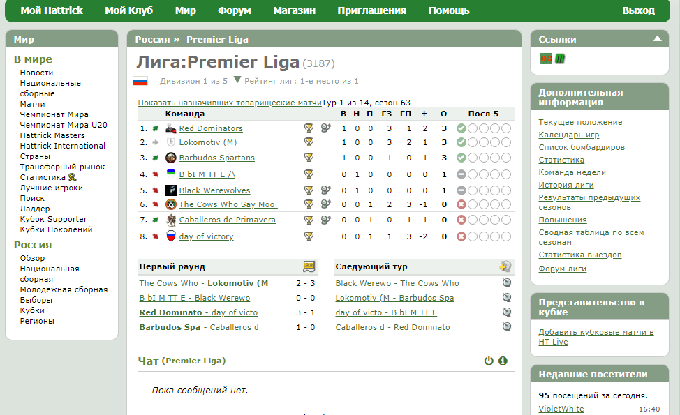 Привет! Если вы зашли сюда, значит вам интересен футбол и спортивные компьютерные игры. Знакомьтесь, первая в истории футбольно-экономическая онлайн-стратегия Хеттрик. 7 июня 2020 игре исполнилось 23 года. Менеджеры со 139 стран мира развивают свои футбольные клубы и соперничают друг с другом. В игре не требуется донат. Вы может стать чемпионом совершенно бесплатно. Нужно просто показать свое мастерство управленца. В игре не нужно висеть безвыходно, уделять внимание 1 час в неделю вполне достаточно, чтобы успешно развиваться. Матчи происходят по средам и воскресеньям. Вы можете достичь вершин и выиграть Российский титул, Международный титул среди команд и Чемпионата мира среди молодежных и старших сборных. Главное это желание. Сейчас прошел первый тур 63-го чемпионата России Вот так выглядит сейчас Российская премьер-лига В России 5 дивизионов, во втором дивизионе играют 32 команды в 4-х лигах, в 3-м - 128 команд в 16-ти лигах, в 4-ом - 512 команд в 64-х лигах, в 5-ом - много пусты