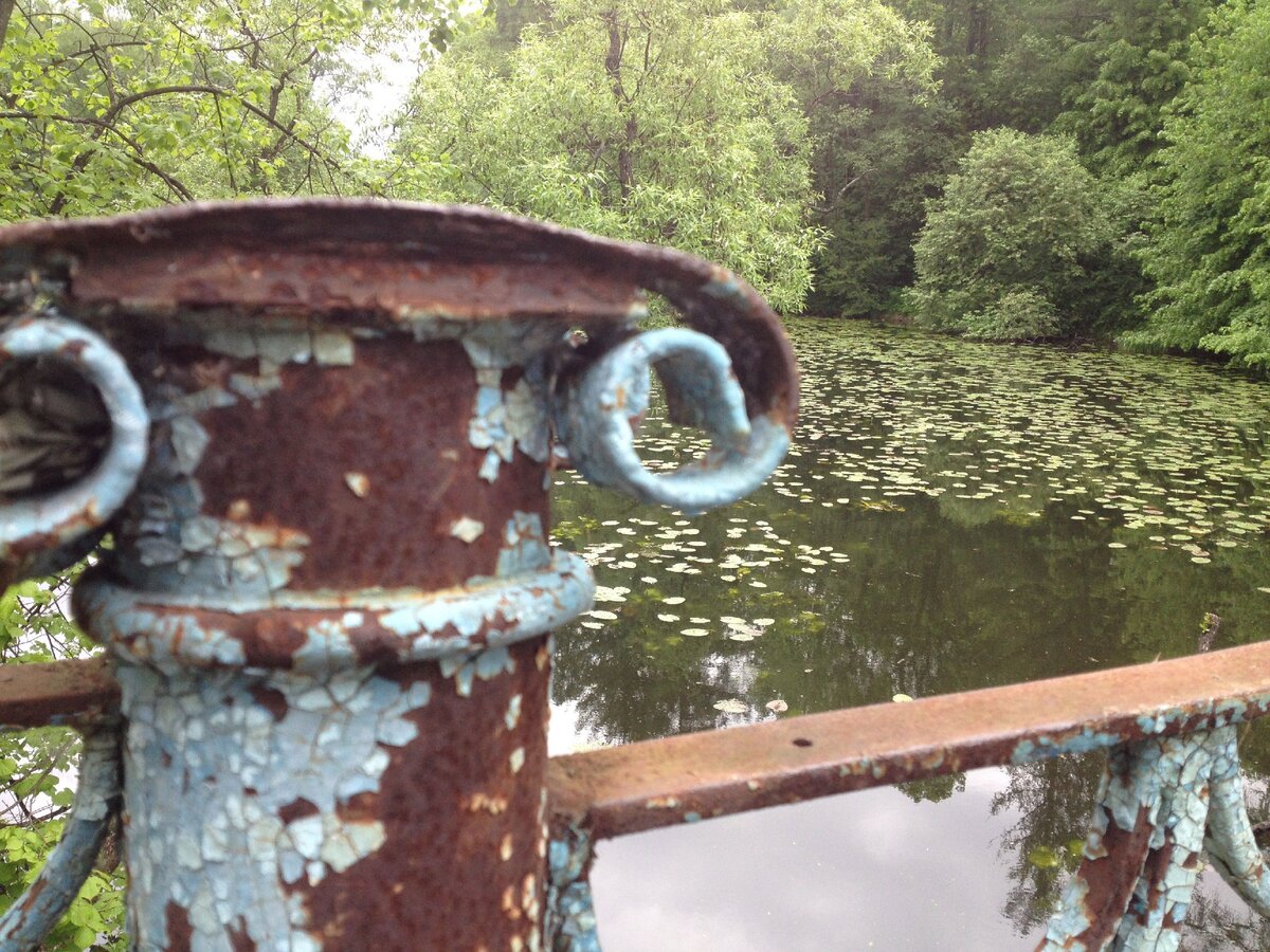 Даже сегодня, когда за этой территорией нет регулярного ухода, в парке можно найти немало интересных мест и живописных деталей. Есть мостик с облезлыми перилами, но довольно колоритными маленькими колоннами из металлических труб при въезде на него.