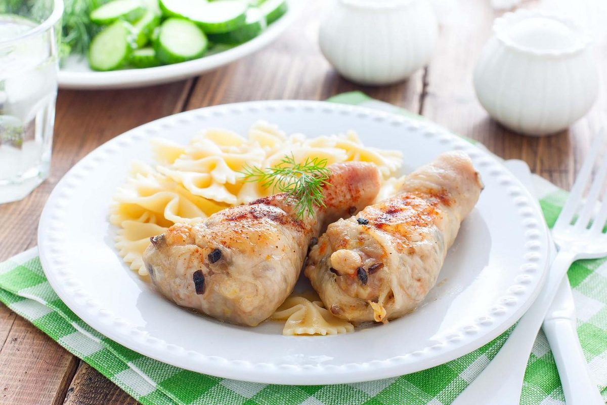 Куриные ножки фаршированные грибами в духовке без кости подавать горячими. Это универсальное блюдо, которое прекрасны сочетается со многими гарнирами: макаронами, рисом, картофелем, овощами.