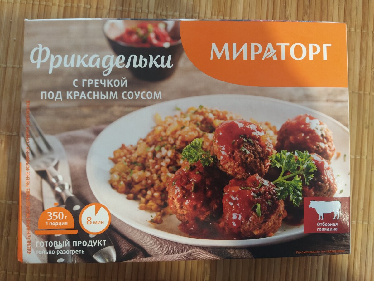 День добрый, дорогой читатель. Видимо началась белая полоса, и ко мне в руки попадают исключительно удовлетворительные разогревайки. Сегодня решил взять на обзор, то что сам беру постоянно-Мираторговские фрикадельки с гречей. Состав: Фрикадельки под красным соусом: вода питьевая, томаты, лук репчатый, сердце говяжье, говядина, мясо куриное, морковь, мука (пшеничная, соевая), белок соевый, масло сливочное (содержит молоко), специи (лук, чеснок), ароматизаторы натуральные, масло растительное, соль, чеснок сушеный, молоко сухое, сахар, зелень петрушки сушеная, сироп глюкозный сухой, усилитель вкуса и аромата Е621, перец черный молотый, антиокислитель аскорбиновая кислота, экстракт белого перца, ароматизатор. Гарнир: вода питьевая, крупа гречневая, масло растительное, соль. Состав хорош,ничего сверхъестественного,поэтому и беру периодически. Греем в СВЧ,к слову,это наверное единственное блюдо,которое разогревается за 8 заявленных минут. Немного отвлекусь,на обложке отпечатаны,так же и др