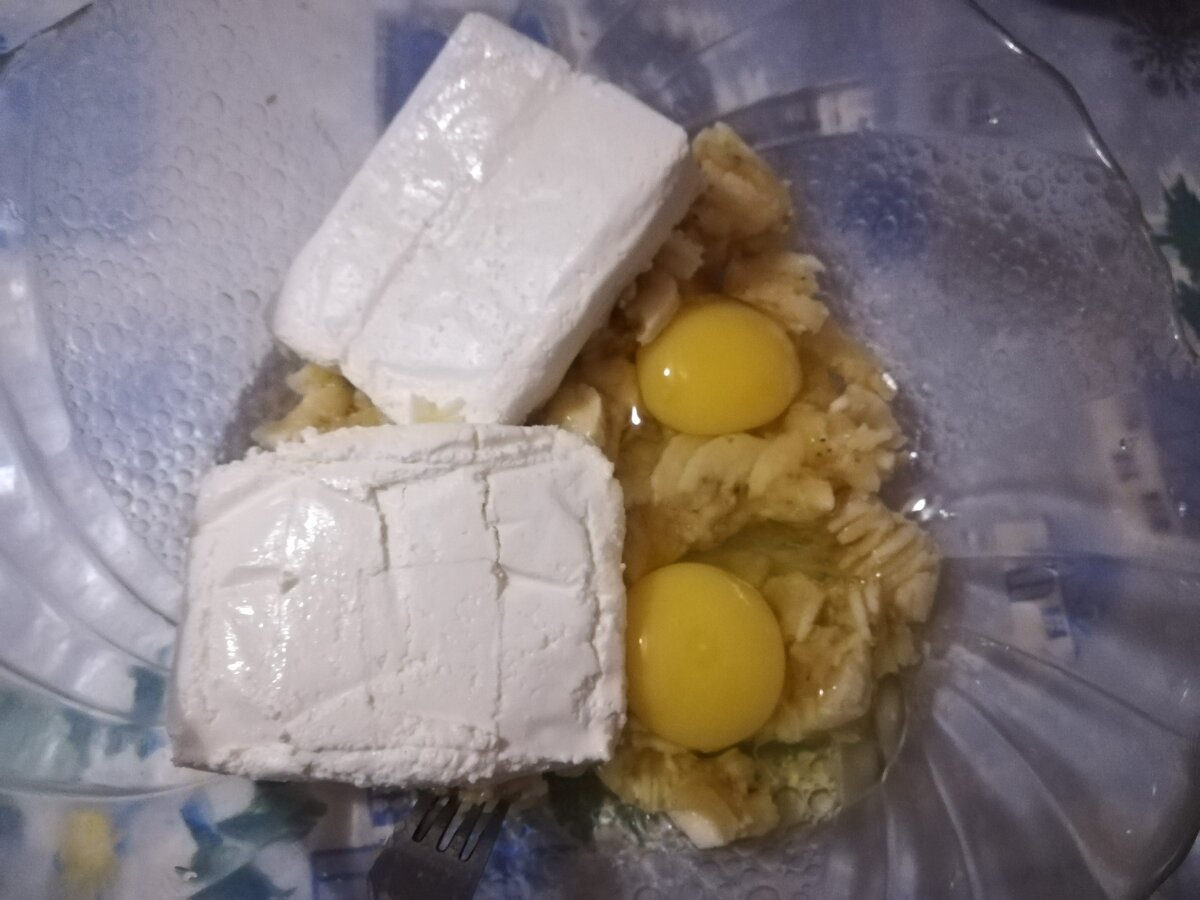 Банан размять вилкой, добавить к нему яйца, сахар и творог, перемешать.