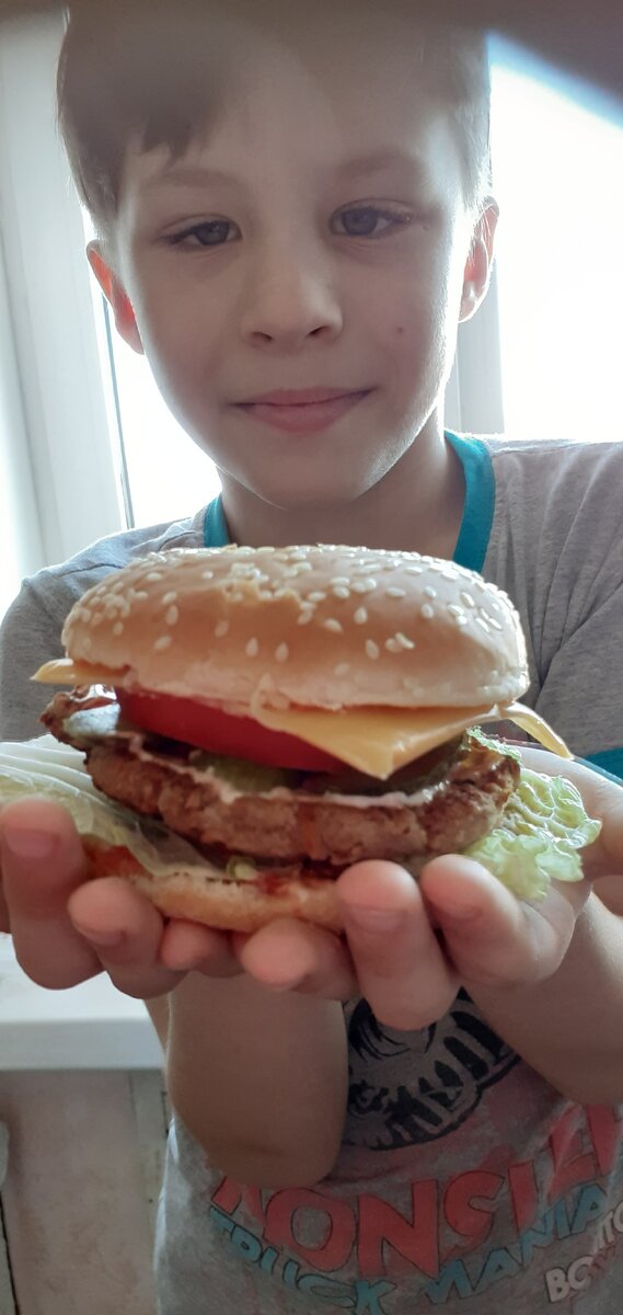 Делаем фарш из свинины и курицы добавляем соль яйца приправы и ме всё мешаем. Потом на розогретую сковороду с маслом выгладываем наши котлеты и прижимаем вокруг чтоб форма была для наших булочек чтоб долщина котлет была 1 см. И жарим по 5-7 минут с двух сторон. Потом берем помидоры огурцы соленые и салат и нарезаем всё по форме булочек. Берём наши покупные булочки нарезаем и начинаем, сначала соус, можно кетчуп потом майонез всё размазываем ложим сверху лист салата, котлету, соленые огурцы,помидоры и сыр плавленый и сверху можно опять соус из кетчупа и майонеза и закрываем второй половиной булочки вуоля и всё готово. Приятного апетита....
