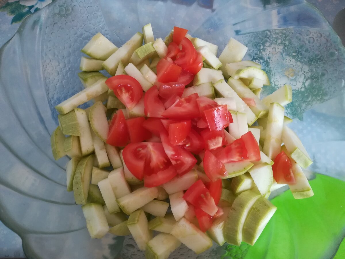 нарезаем кабачок и помидор, складываем в миску