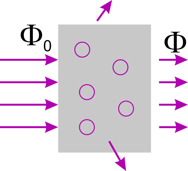 Рисунок. Первоначальный поток излучения Ф0 падает на равномерный слой вещества. При его прохождении он частично рассеивается в разные стороны и частично поглощается (фиолетовыми кружками показано локальное поглощение), поэтому после слоя вещества величина потока уменьшается.