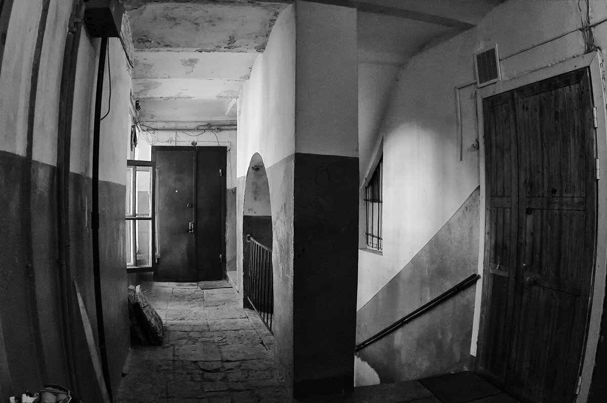 Я очень люблю округлые линии в архитектуре. Мне нравятся все формы, в которых используются дуги, но больше всего те, где их использование не является обязательным. Избыточность создаёт впечатление роскоши, полёта, свободы. Эта внутренняя лестница находится во дворовом флигеле доходного дома. Здесь важно уточнение, что флигель дворовый. Те корпуса доходных домов, которые стояли на красной линии улиц были дорогими, квартиры в них пользовались спросом у зажиточных арендаторов. Качество жизни во дворовых флигелях было значительно ниже. Ко входной двери нужно было идти через лабиринт дровяных сараев и конюшен, дворы не были особенно чистыми. Лестницы в таких домах были тесными и узкими. Но арочные своды делают их красивыми и романтичными. Здесь фотографии двух лестниц. Я сфотографировала эти лестницы в доме на набережной Пряжки реки, 50. Первая лестница, с арочным сводом, находится в дальнем флигеле, в самом конце двора. Она была построена в середине XIX века, предположительно в 1837 го