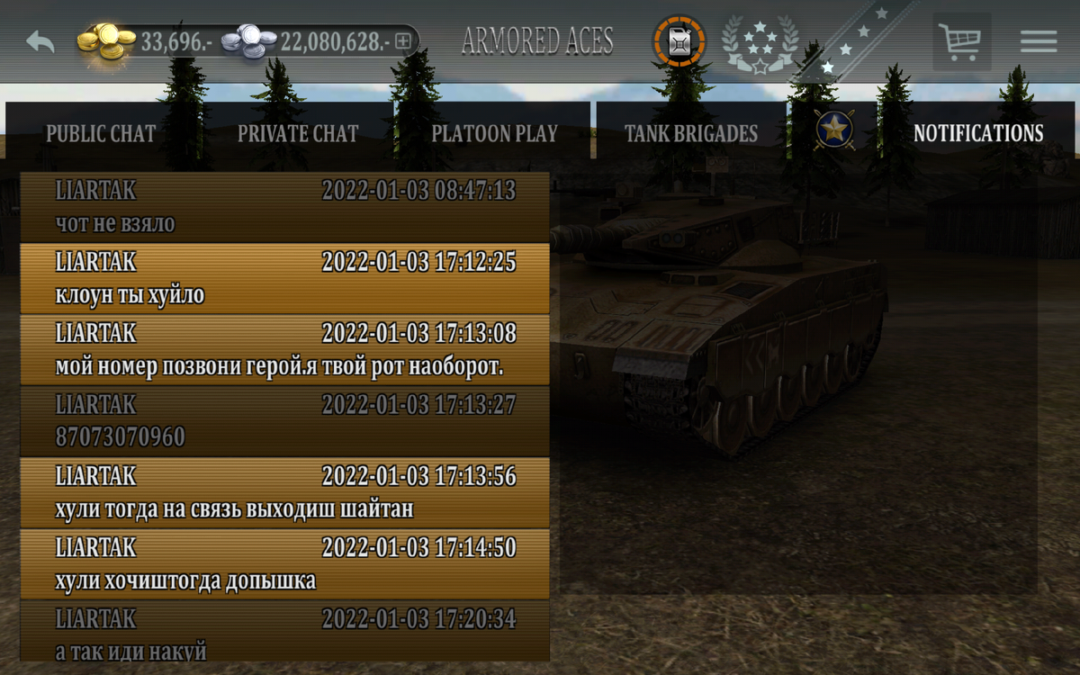 И..., что всегда раздражало/ет меня в АА - это то что происходило и происходит в общем/pablik чате и на поле боя! Некоторые игроки частенько пишут в ^паблик/приват^ чатах разного рода глупости/колкости/мерзости. Интернет уравнял школоту с пенсионерами, позволяя вполне безнаказанно хамить кому угодно, не боясь за это ата та по попе...