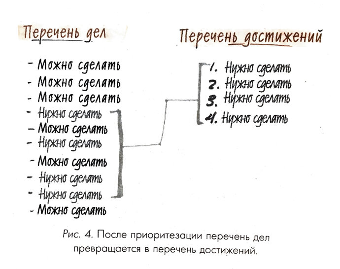 Возможно, все сталкивались с такой проблемой, как нехватка времени. Но если подойти к проблеме основательно можно увидеть, что время никого не ждёт и мы, так и не успеваем выполнять намеченный план до конца. И что же с этим делать!? Деятельность успешных людей всегда определяется ясным пониманием приоритетов. (Гери Келлер, Джей Папазан «Начни с главного) Вот и нашли первый выход. Правильная расстановка приоритетов. Сначала все самое важное,сложное, главное, а затем уже все остальное. Причём, если вы начнёте делать самое сложно в начале то, закончив его, вы поймёте, что все оставшиеся дела мелочь и с легкостью справитесь с ними. Перечень дел - не более чем перечень повседневных занятий, каждое из которых занимает какое-то место в вашей жизни и в отдельно взятом ее дне, но не является основанием для следующего, чтобы они выстраивались в цепочку, последовательно ведущую к жизненному успеху. Вывод: Перечень дел - это все те дела, которые не требуют мозгового штурма (полить цветы, по