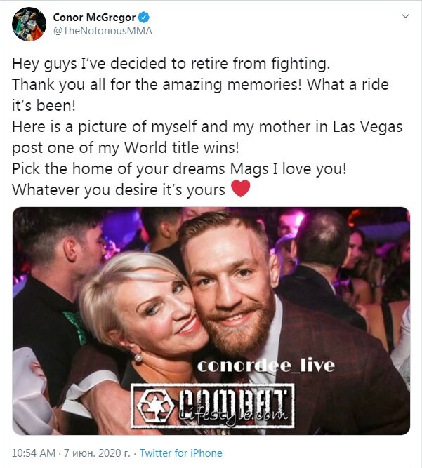 Вчера,Конор опубликовал следующее в твитере Эй парни я решил завершить карьеру бойца,спасибо всем за чудесные воспоминания! Вот это поездочка вышла.Вот одна из моих фото с мамой,сразу после победы в титульном бою.Выбери себе любую мечту,я люблю тебя.Что бы ты не пожелала,оно твоё "написал Конор Макгрегор"