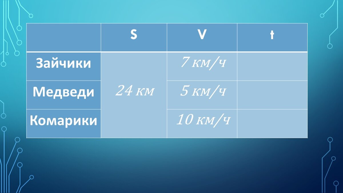 Большой цикл задач на движение начнем сегодня. Задача 1 Одновременно навстречу друг другу из пункта А выехали медведи на велосипеде, а из пункта В – зайчики на тарантайчике. В это же время из А вылетели комарики на воздушном шарике. Долетев до зайчиков, они повернули назад, долетели до медведей, снова повернули назад и т. д. Сколько километров пролетят комарики до встречи медведей и зайчиков, если скорость зайчиков – 7 км/ч, медведей – 5 км/ч, комариков 10 км/ч, а расстояние от А до В равно 24 км. Заполним стандартную таблицу для задач на движение: Как движутся медведи и зайчики? На встречу друг другу. Значит мы можем узнать их общую скорость, которая называется скорость сближения: Затем узнаем время, за которое они с такой скоростью пройдут весь путь. Нам не важно сколько конкретно медведи проедут до места встречи, и сколько зайчики. Главное, что за узнанное нами время они преодолеют всю дистанцию. И важно, что они будут находится в пути до места встречи одинаковое время. Теп