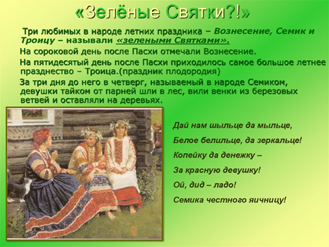 Из народных «традиций» на просторах интернета можно также встретить: начало купального сезона в Духов день, гадания по венкам на воде, прогноз погоды на основе того, идет ли дождь. Также это время известно, как «именины земли», или «день земли», когда вводился запрет на посевные работы для «отдыха» почв. Однако, можно ли работать на земле, – сегодня решают, конечно, преимущественно исходя из сельскохозяйственного годового цикла, а не из суеверий.