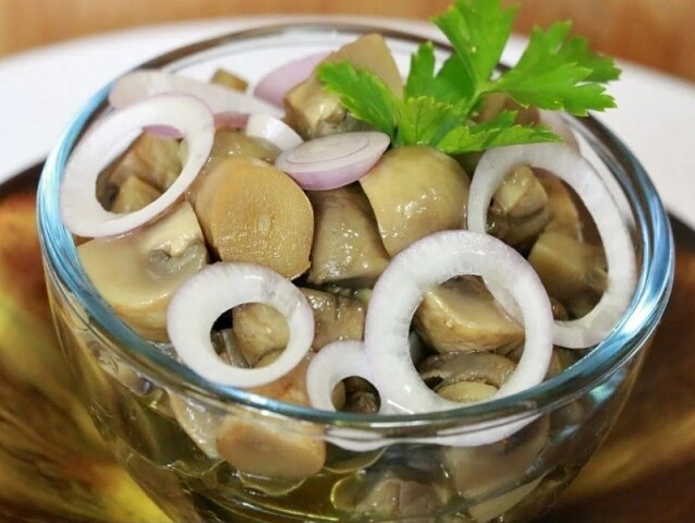 Начну с совета: грибы лучше покупать мелкие, т.к. они будут аппетитнее смотреться в блюде! Крупные грибы рекомендуется разрезать на 2-3 части по вертикали, чтобы на срезе была форма грибка. Первый способ: в банку укладываем всякую зелень: пучок укропа, листья смородины, вишни, мелко нарезанные чеснок и корень хрена, 10-15 горошин чёрного перца, грибы. Заливаем рассолом, закрываем капроновой крышкой и, если температура воздуха высокая, ставим в холодильник на 2-3 суток. Второй способ - без воды: всё укладывается в кастрюльку, пересыпается солью, накрывается тарелкой и сверху ставится гнёт. Если в комнате прохладно, то я советую на сутки банку (или кастрюльку) оставить в помещении, а затем поставить на 2 суток в холодильник, чтобы грибочки были крепенькие. Чем крупнее грибы, тем больше времени потребуется для их приготовления. И ещё маленький совет: чеснок и хрен лучше закладывать в последнюю очередь, т.е. на грибы. Для рассола берём три столовые ложки соли на один литр к