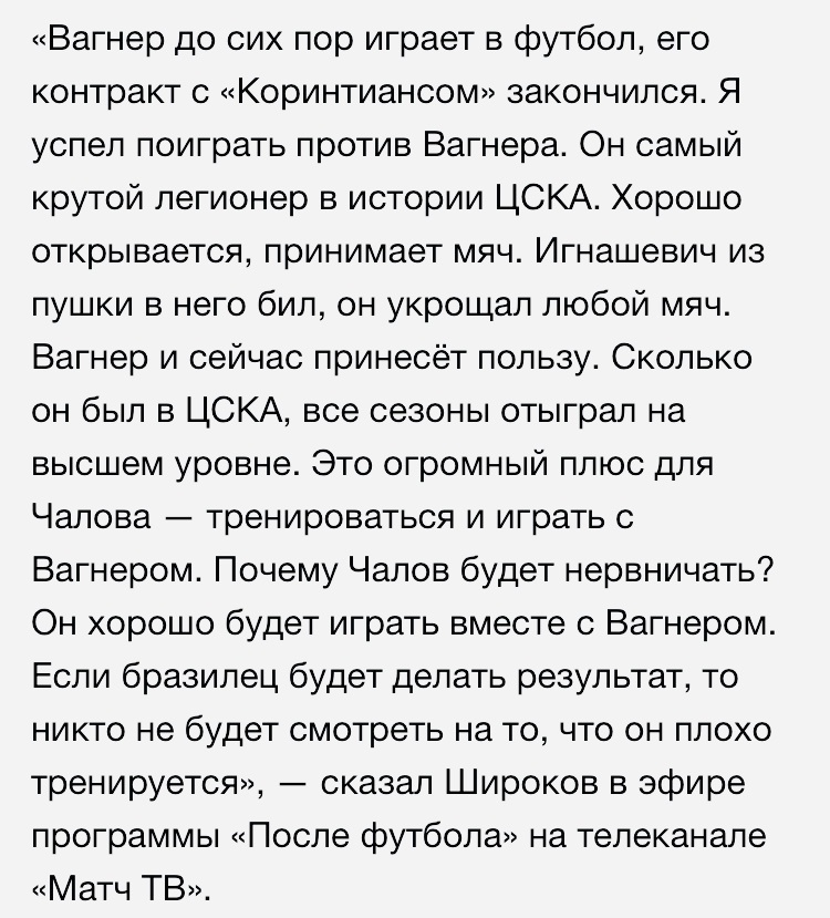 Сегодня должна появиться информация о дальнейшем будущем Вагнера Лава. Он сам заявил, что в понедельник он будет знать где продолжит карьеру. Игрок ещё не присоединился к команде, а шума эта новость наделала очень много. Давайте посмотрим что об этом возможном переходе говорят футболисты и тренеры: 1) Роман Широков. 2)Александр Мостовой. 3)Анатолий Бышовец. Почти все сходятся во мнении что Вагнер ЦСКА поможет, несмотря на его возраст. Многое конечно будет зависеть от желания самого игрока, на сколько он сейчас готов впахивать на тренировках, чтобы подойти к играи в нужных кондициях. Ведь игра Вагнера во многом была построена на скорости и на своевременных открываниях. Да скорее всего играть весь матч он не будет, а вот выйти на 25-30 минут под уставших защитников он вполне бы мог. Хотя возможен и вариант с одновременным выходом впереди с Чаловым или Шкуриным. Ещё хотелось бы вспомнить тандем Дзагоев-Вагнер. Именно в сезоне 2007/2008 Алан стал играть за команду в основном составе, и то