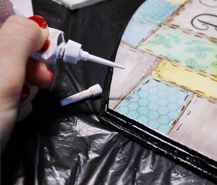 Имитация лоскутного шитья с помощью декупажа и акриловых красок. Материалы: акриловый краски, грунт, клей для декупажа, лак, медиум 693 и коричневый медиум 819 Playd, декупажные карты Base of Art, контурные краски.