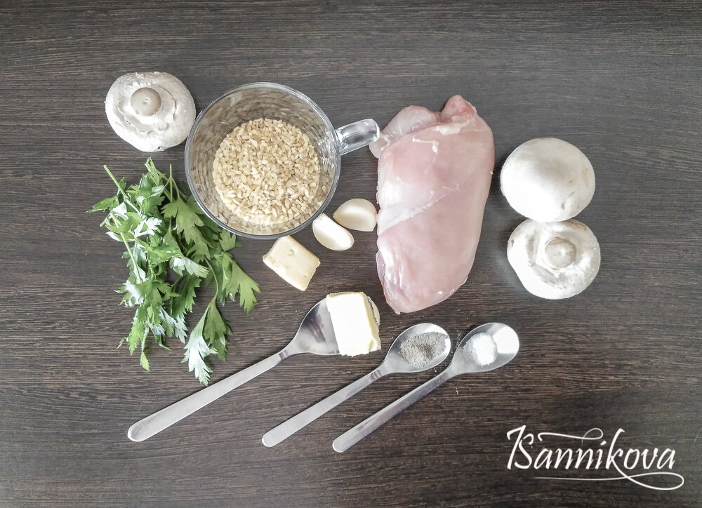 Ссылка на рецепт: https://ksenia-sannikova.ru/base/cat55/recipe245/ Ингредиенты: Готовим: 1. булгур заливаем водой в соотношении 1:2, доводим до кипения, накрываем крышкой и варим на среднем огне 10 минут (пока крупа не впитает всю воду) 2. петрушку и укроп мелко рубим ножом, куриное филе режем кубиками среднего размера, шампиньоны дольками (если хотите, то оставьте 2 слайса из грибов на украшение), сыр натираем на тёрке 3. на разогретую сковороду добавляем сливочное масло, чёрный перец и чеснок, жарим 30 секунд на среднем огне 4. затем добавляем грибы, обжариваем до золотистого цвета 5. после, добавляем куриное филе, мешаем, жарим под крышкой 2 минуты, затем снова перемешиваем и снова накрываем крышкой, жарим ещё 1 минуту 6. затем добавляем булгур, сыр и петрушку, перемешиваем, выключаем огонь и накрываем крышкой, оставляем на 3 минуты 7. наш булгур готов, можно подавать к столу