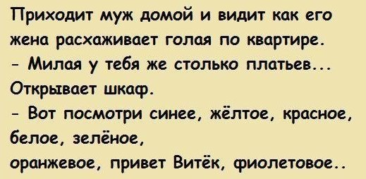 Все из открытых источников Новинка! Надувная кукла Вуду! Теперь вы можете воткнуть в своего врага не только иголку... + Посетитель кафешки делает заказ, спрашивает пышнотелую официантку: - Что у вас на первое? - Разве что только кислые щи да борщ вчерашний. - А на второе? - Ой, на второе, ну, я даже и не знаю, кризис просто, хоть сама на стол ложись! - Отлично! Первого не надо, два вторых, пожалуйста! + Депрессия - это когда просмотр порнофильма заканчивается размышлениями о судьбе главной героини. + - Пойдем ко мне? У меня дома игровая приставка есть. - Какая? - Ну, если долго играть - сантиметров 20 + Передача на радио. Позвонившим предлагают назвать слово, которого нет в словаре, но которое в предложении может иметь смысл. Итак, звонок. - Здрасьте, вы кто? - Я Петя. - Ваше слово? - Шолб. По буквам: Ш-О-Л-Б. - Такого слова в словаре нет. У вас все шансы выиграть путевку. Теперь скажите осмысленное предлложение с этим словом. - Шолб ты на х@й! Телефонный звонок мом