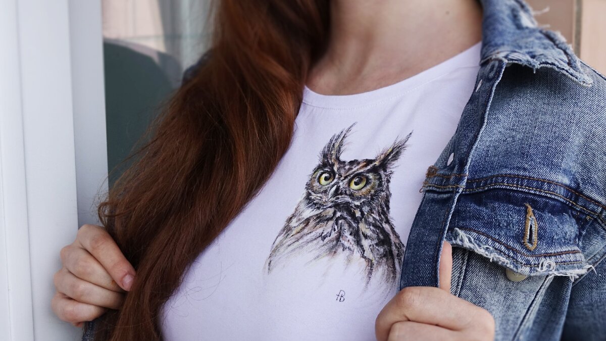 Как сделать рисунок на футболке своими руками? Нужно просто взять акриловые краски на рисовать то, что нравится. Например строгую пушистую сову.