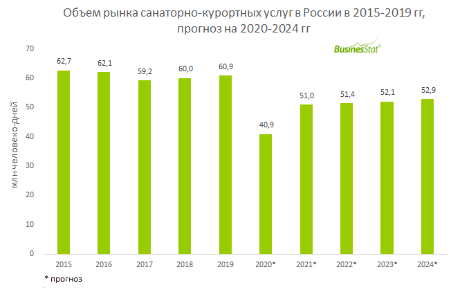 В 2015-2019 гг объем рынка санаторно-курортных услуг в России снизился на 2,8% до 60,9 млн человеко-дней.