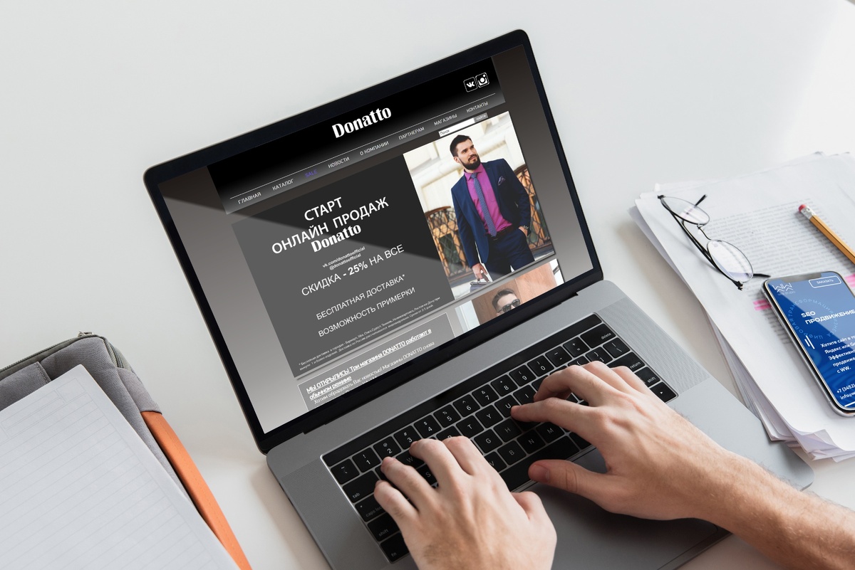Двое мужчин в ярких костюмах, онлайн-продажи возможность примерки, три магазина - вот и все маркеры, бросающиеся в глаза, которые, впрочем, уже создают ощущение торговли мужской одеждой.