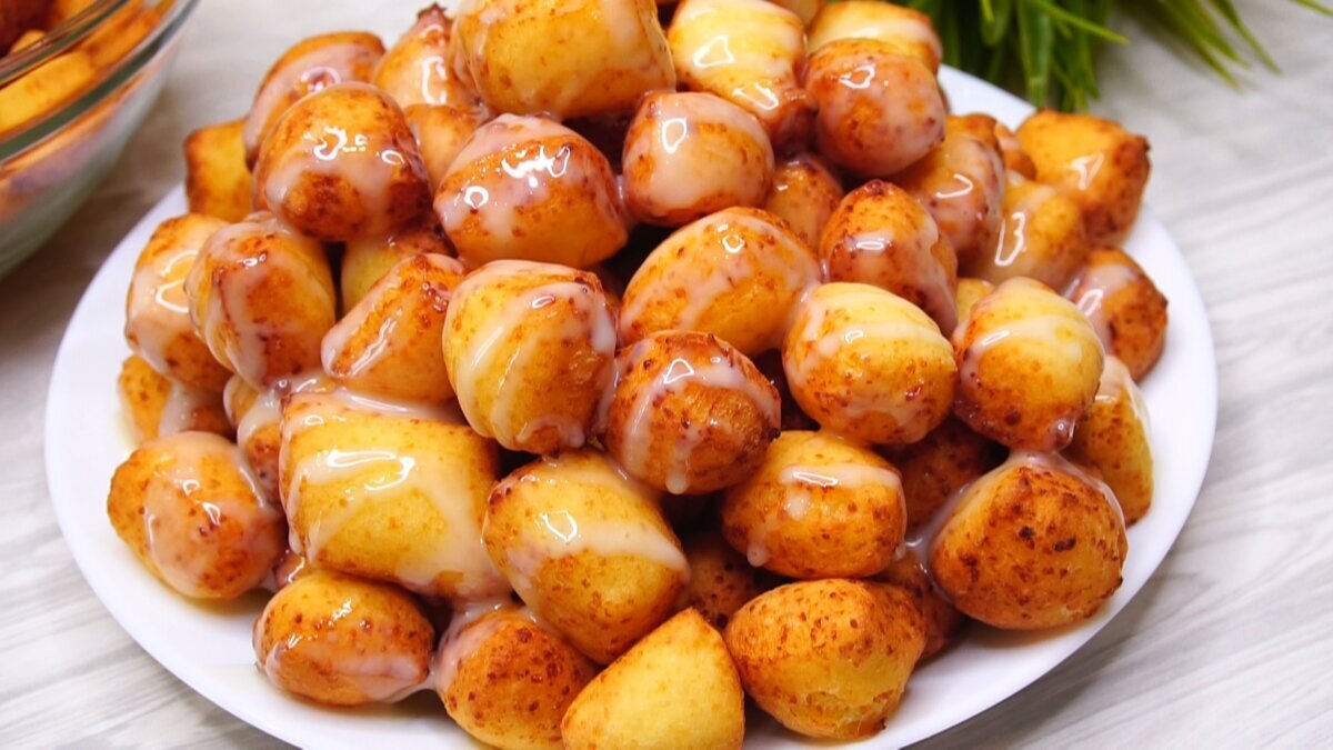 В сотейник наливаем растительное масло и разогреваем. Кладем заготовки и жарим на среднем огне до золотистого цвета. Снимаем на бумажное полотенце, чтобы ушло лишнее масло. Из небольшого набора продуктов получается большая тарелка вкусной выпечки. Поливаем сгущенным молоком или шоколадом, или сахарной пудрой. Вкусно и горячем и холодном виде.