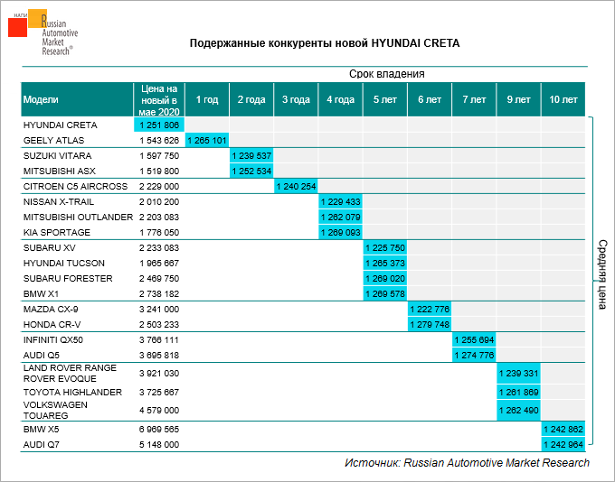 Скачать Согласно данным Russian Automotive Market Research, HYUNDAI CRETA остается самым популярным кроссовером на российском рынке. По итогам четырех месяцев 2020 г. реализовано 21,2 тыс. экземпляров этой модели.Средняя цена на новую HYUNDAI CRETA составляет 1 млн 252 тыс. руб. В таблице ниже представлены модели поддержанных кроссоверов в ценовом диапазоне от 1 млн 220 тыс. до 1 млн 280 тыс. руб.По цене новой HYUNDAI CRETA можно приобрести подержанный премиальный кроссовер, например, 7-летний INFINITI QX50 или LAND ROVER RANGE ROVER EVOQUE, находящийся в эксплуатации 9 лет.Среди более «свежих» конкурентов HYUNDAI CRETA японские модели SUZUKI VITARA и MITSUBISHI ASX возрастом 2 года, а также 1-летний китаец GEELY ATLAS.Более подробная информация представлена в отчете «Анализ потери стоимости и остаточной стоимости ТОР-150 моделей легковых автомобилей возрастом до 10 лет».