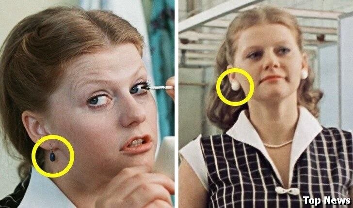 - Так, в одной из сцен фильма, где Людмила начинает прихорашиваться после работы, то мы можем заметить на ней синие серьги. Но через пару секунд Людмила выходит из гардеробной в белых клипсах. К тому же, укладка актрисы будто изменилась.