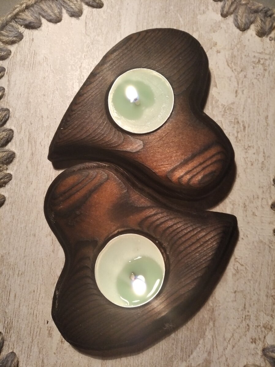 Дело было вечером , делать было нечего. Семья наша любит романтические вечера, вот и пришла идея сделать пару подсвечников из дерева. Для начала был сделан шаблон сердечка из плотной бумаги и контур обведён карандашом. За основу была взята дощечка из сосны толщиной 2 см. Обведя контур , сердечки были выпилены с помощью электролобзика прикрученного к дощечке. Хотя можно выпилить и ручным лобзиком. После выпиливания , для красоты зашлифованы были края заготовок наждачной бумагой. А в центре , с помощью дрели и насадки по диаметру будущей свечки высверлено посадочное место. Место делали под стандартные ароматические свечки. Затем с помощью газовой горелки обожжена вся поверхность изделий. В принципе можно обжечь и над газовой плитой. И слегка с обратной стороны тоже. После обжига , от золы заготовки были зачищены старой щёткой для одежды . Так сказать брашировка. Теперь пришло время обработки. Было принято решение обработать льняным маслом. Масло некоторое время впиталось, а потом се