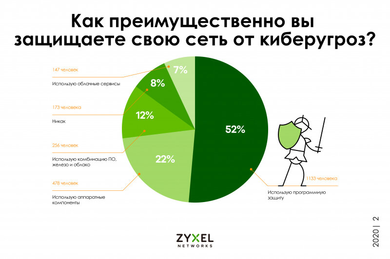 Zyxel опросила в мае 2020 года более 1800 специалистов из России и ближнего зарубежья. Вопросы касались информационной безопасности, при этом участникам не назывался заказчик исследования, чтобы не влиять на результаты опроса, т.к. были вопросы, касающиеся марок применяемого оборудования. Первый вопрос был «Какие средства используются в компании для защиты сети от киберугроз»? Ответы распределились вполне предсказуемо: 52% используют программную защиту и 22% аппаратную, однако удивило, что 8% опрошенных никак не защищают свою сеть и это при том, что в новостях регулярно сообщают о взломах сетей предприятий и о краже персональных данных. Видимо, сильна еще надежда на «Авось» среди наших технических специалистов. Ответы на вопрос «Какому производителю аппаратных решений вы отдаете свое предпочтение?» были довольно предсказуемы: безоговорочным лидером является Cisco c более чем 33%, следом за ней идет Zyxel c 13% и замыкает тройку лидеров Huawei c 11%. Если сравнивать результаты по набор