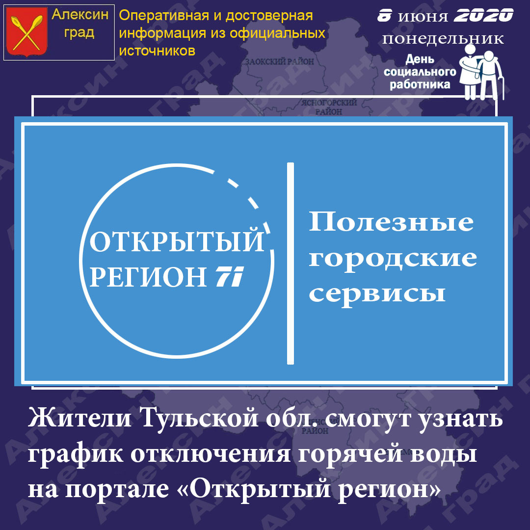 Жители Тульской области смогут узнать график отключения горячей воды на портале «Открытый регион». 💧 Для этого нужно 🔸 перейти по ссылке 👉 https://or71.ru/discover/hotwater/ 🔸 выбрать город или район проживания, указать улицу и дом. Кроме того, на портале собраны полезные номера телефонов и ответы на часто задаваемые вопросы, касающиеся отключения воды.