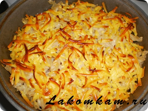 Получившейся смесью заливаем макароны. Посыпаем тёртым на крупной