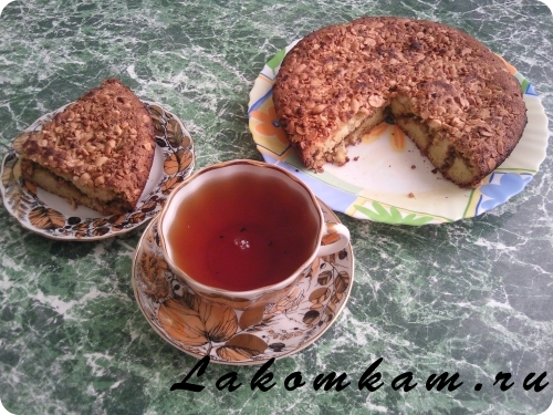 и ставим в духовку на 30 минут при температуре 180 градусов. Горячий пирог ставим на мокрую салфетку на 5 минут, чтобы дно пирога легко отставало от формы, даем немного остыть, затем разрезаем