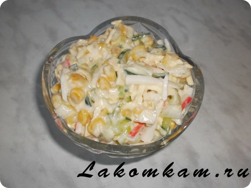 Смешиваем кукурузу, сыр, крабовые палочки, помидор или огурец и лук.