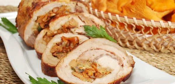 Ингредиенты: свинина (подойдёт шейная часть или корейка) 1 кг грибы (лисички или другие) 200-300 г сыр (типа гауды) 100 г лук репчатый 0,5-1 шт чеснок 1 зубчик зелень укропа или петрушки растительное масло для жарки сливочное масло – смазать форму соль свежемолотый перец Приготовление: 2. Натереть мясо солью и перцем по вкусу. 3. Перебрать, вымыть и обсушить грибы. Репчатый лук очистить, нарезать четвертькольцами или мелкими кусочками. Зелень ополоснуть, обсушить, измельчить. Чеснок очистить и пропустить через пресс. Сыр натереть. 4. Сковороду с растительным маслом разогреть на умеренном огне и обжарить грибы, помешивая время от времени, пока не выпарится влага. Затем добавить ещё масла и подрумянить. 5. В отдельной сковороде разогреть растительное или сливочное масло и поджарить лук. Смешать с грибами, добавить соль и перец по вкусу, охладить. Добавить сыр, зелень, чеснок. 6. Выложить начинку на мясо и свернуть в рулет, стараясь сохранить всю начинку внутри. Скрепить рулет зубо