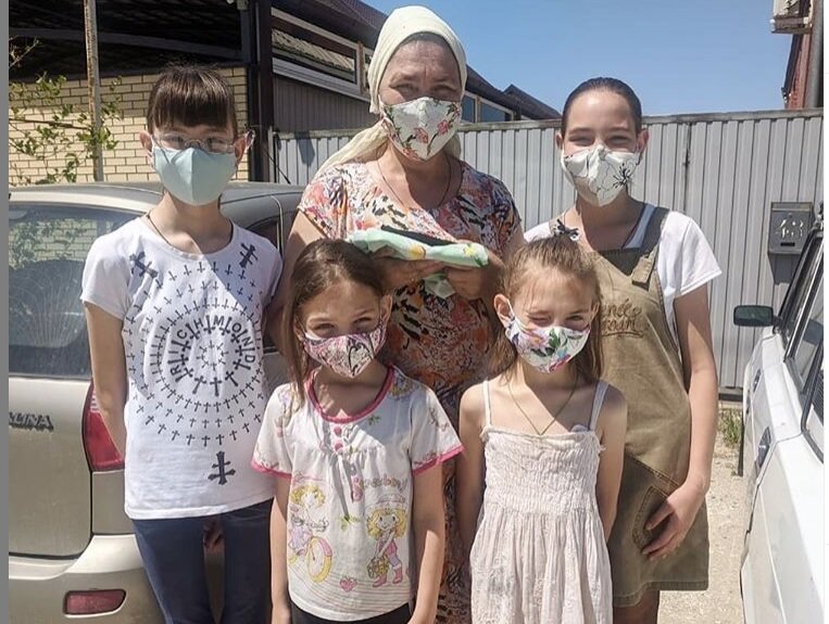 Сегодня мы передали маски и отрез ткани маме 8(!) детей: 4 совершеннолетних юношей и 4 девочек (на фото).