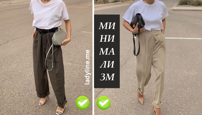 Трендовый, универсальный и комфортный для многих модниц стиль минимализм включает в себя базовые вещи нейтральных оттенков. Базовые брюки с высокой посадкой + универсальная оверсайз футболка + женственная обувь на высоком каблуке бежевого или нюдового цвета — беспроигрышное сочетание вещей, которое идеально подойдет как юной, так и зрелой моднице.